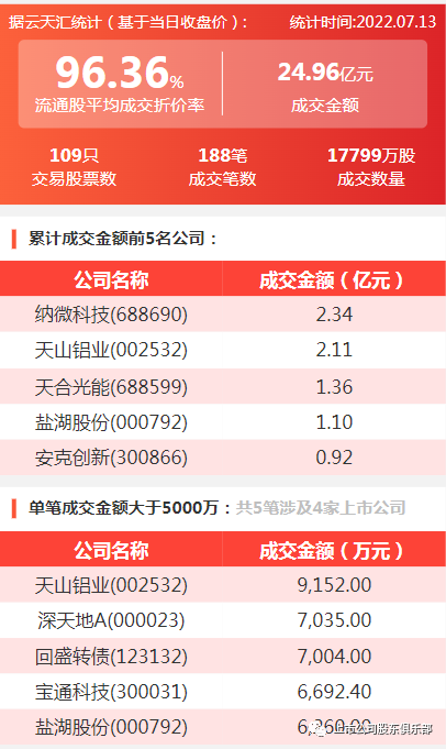 2022年7月13日,大宗交易成交金额24.96亿元,交易股票数109只,成交笔数188笔,流通股平均成交折价率96.36%,成交数量17799万股。