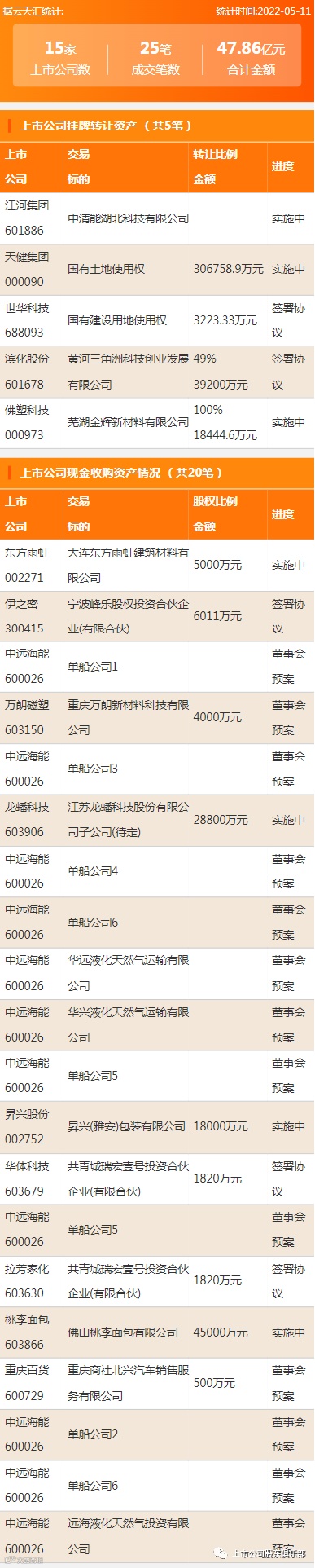 2022年5月11日,资产交易合计金额47.86亿元,上市公司15家,成交25笔,上市公司挂牌转让资产5笔,上市公司现金收购资产20笔。