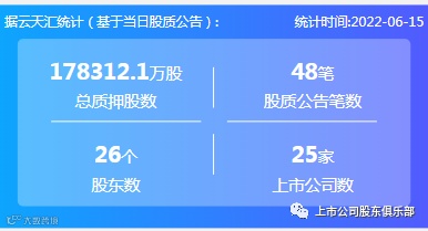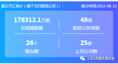 2022年6月15日,股票质押总质押股数178312.1万股,上市公司数25家,股质公告笔数48笔,股东数26个。