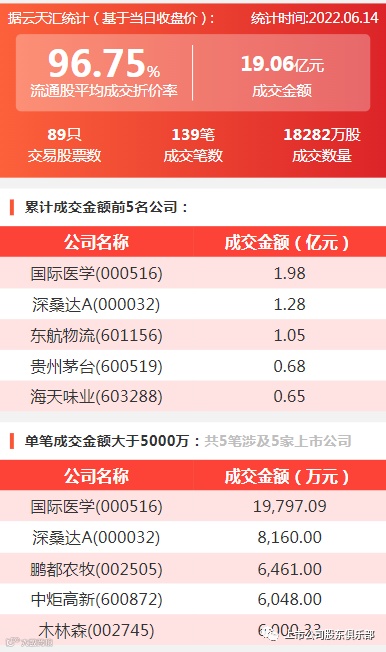 2022年6月14日,大宗交易成交金额19.06亿元,交易股票数89只,成交笔数139笔,流通股平均成交折价率96.75%,成交数量18282万股。
