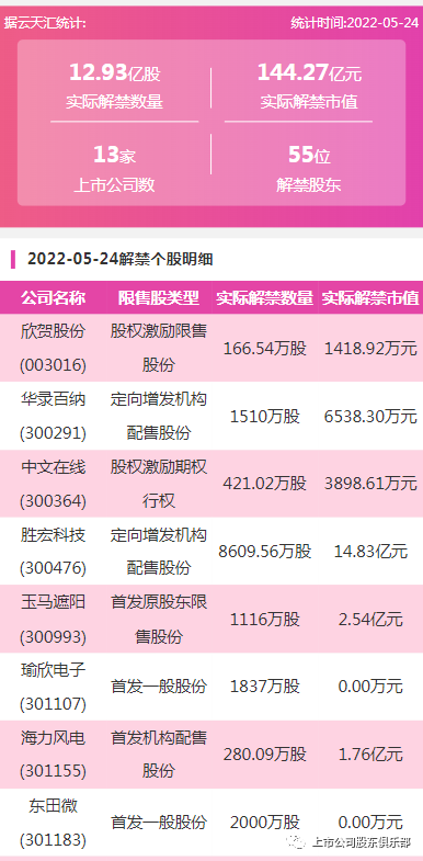 2022年5月24日,实际解禁数量12.93亿股,实际解禁市值144.27亿元,相关上市公司13家,解禁股东55位。