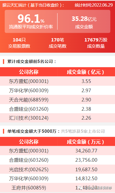 2022年6月29日,大宗交易成交金额35.28亿元,交易股票数104只,成交笔数170笔,流通股平均成交折价率96.1%,成交数量17679万股。