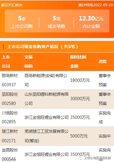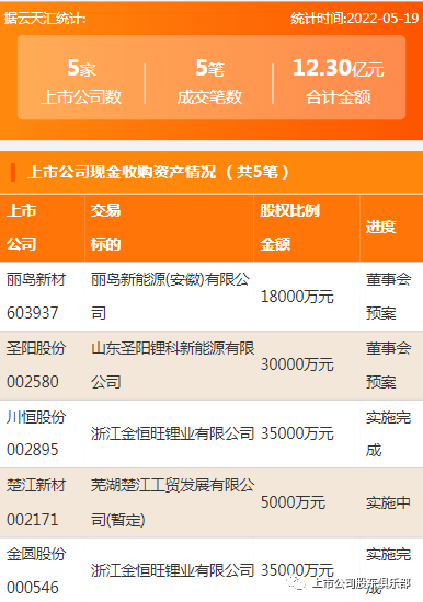 2022年5月19日,资产交易合计金额12.3亿元,上市公司5家,成交5笔,上市公司现金收购资产5笔。