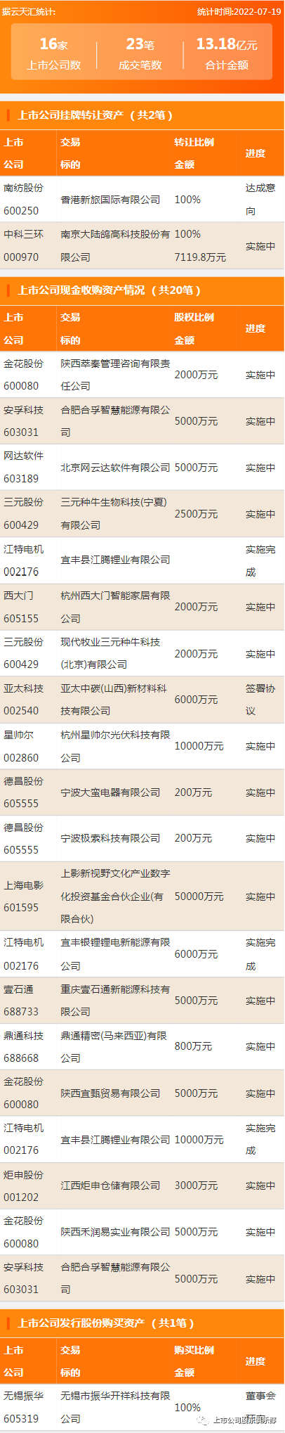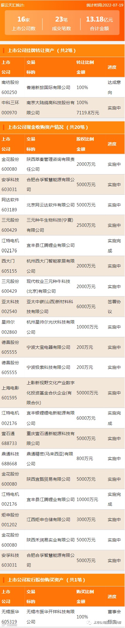 2022年7月19日,资产交易合计成交金额13.18亿元,上市公司16家,成交23笔,上市公司挂牌转让资产2笔,上市公司现金收购资产20笔,上市公司发行股份购买资产1笔。