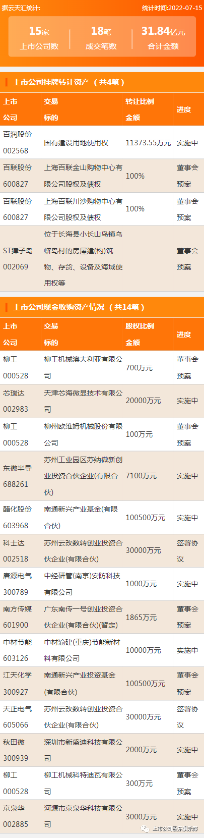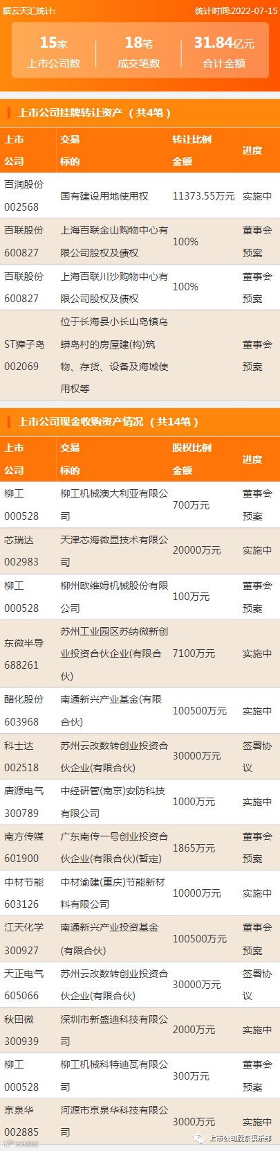2022年7月15日,资产交易合计成交金额31.84亿元,上市公司15家,成交18笔,上市公司挂牌转让资产4笔,上市公司现金收购资产14笔。