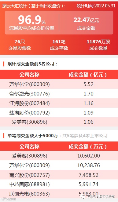 2022年5月31日,大宗交易成交金额22.47亿元,交易股票数76只,成交笔数161笔,流通股平均成交折价率96.9%,成交数量11876万股。