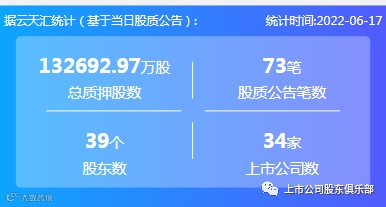 2022年6月17日,股票质押总质押股数132692.97万股,上市公司数34家,股质公告笔数73笔,股东数39个。