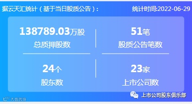 2022年6月29日,股票质押总质押股数138789.03万股,上市公司数23家,股质公告笔数51笔,股东数24个。