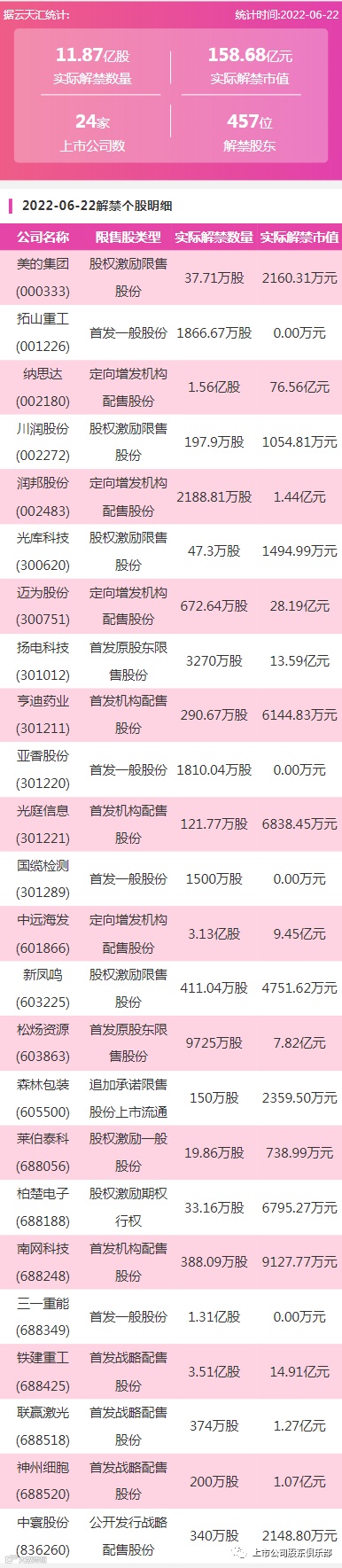 2022年6月22日,实际解禁数量11.87亿股,实际解禁市值158.68亿元,相关上市公司24家,解禁股东457位。