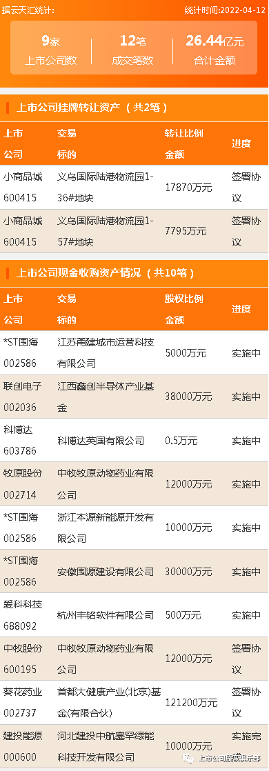 2022年4月12日,资产交易合计金额26.44亿元,上市公司9家,成交12笔,上市公司挂牌转让资产2笔,上市公司现金收购资产10笔。