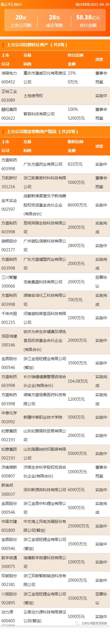 2022年4月29日,资产交易合计金额58.38亿元,上市公司20家,成交28笔,上市公司挂牌转让资产3笔,上市公司现金收购资产25笔。