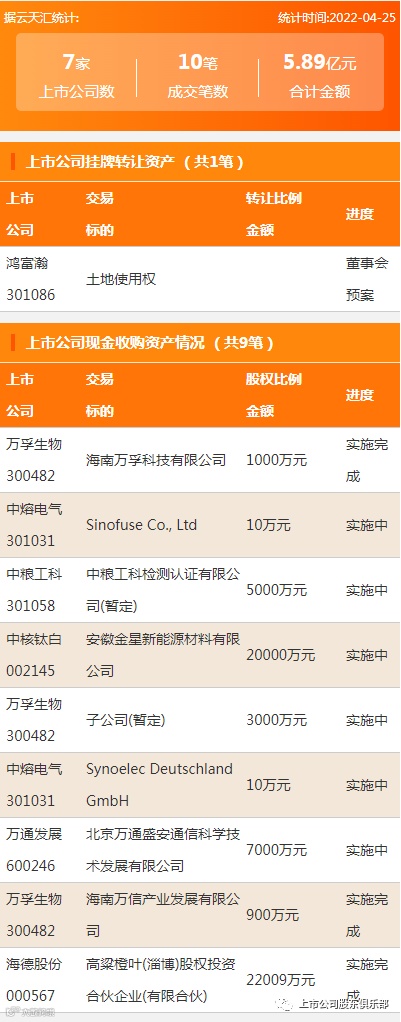 2022年4月25日,资产交易合计金额5.89亿元,上市公司7家,成交10笔,上市公司挂牌转让资产1笔,上市公司现金收购资产9笔。