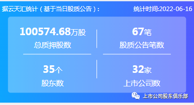 2022年6月16日,股票质押总质押股数100574.68万股,上市公司数32家,股质公告笔数67笔,股东数35个。
