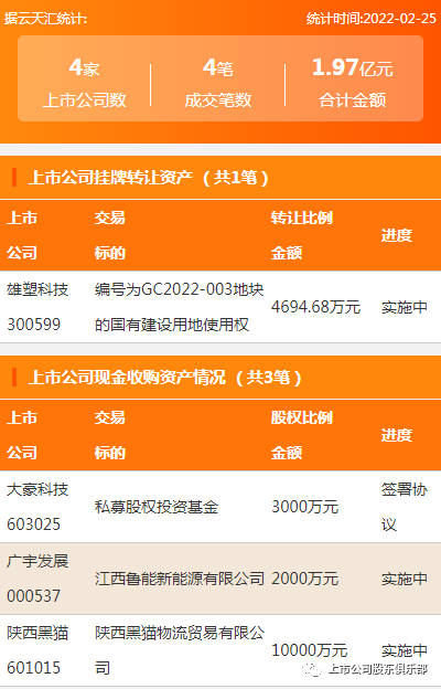 2022年2月25日,资产交易合计金额1.97亿元,上市公司4家,成交4笔,上市公司挂牌转让资产1笔,上市公司现金收购资产3笔。