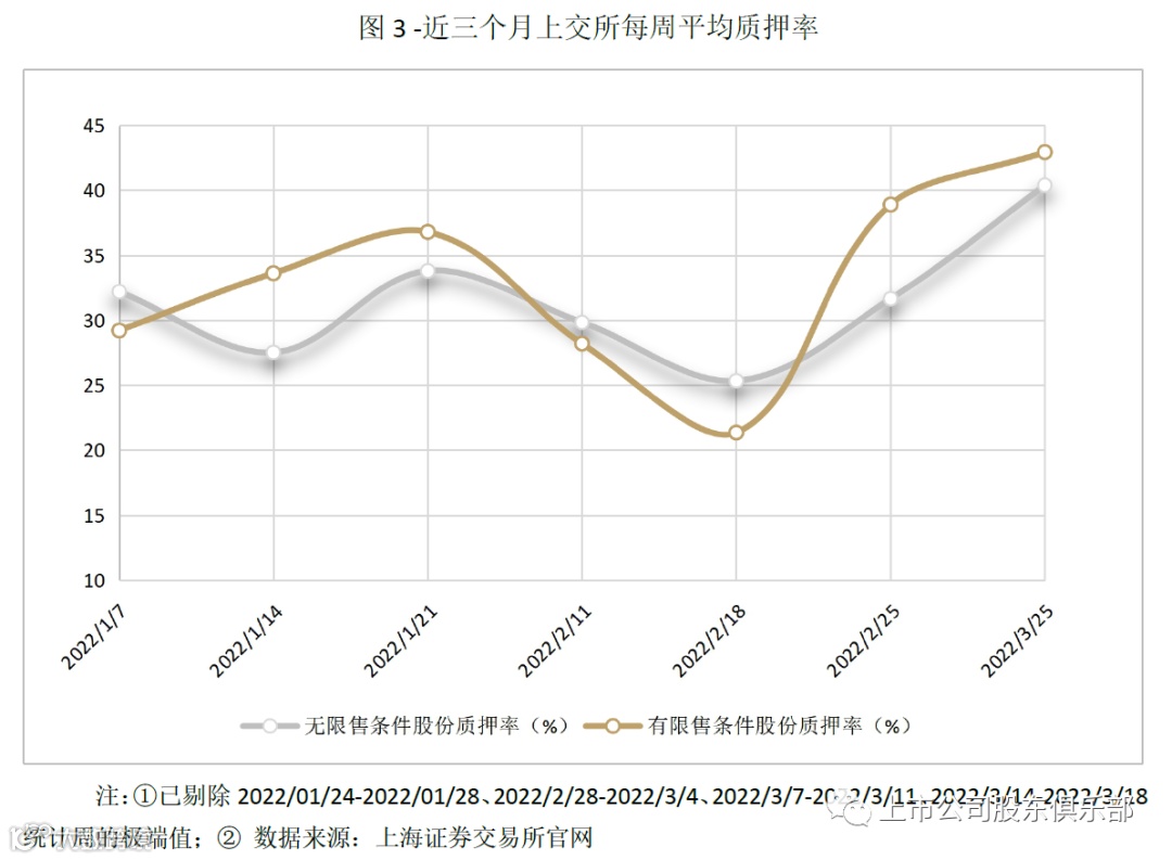3月最后一个交易周数据显示,上交所无限售股质押率为40.39%,限售股质押率为42.94%;深交所无限售股质押率为37.04%,限售股质押率为25.53%。