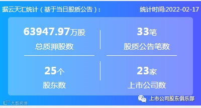 2022年2月17日,股票质押总质押股数63947.97万股,上市公司数23家,股质公告笔数33笔,股东数25个。