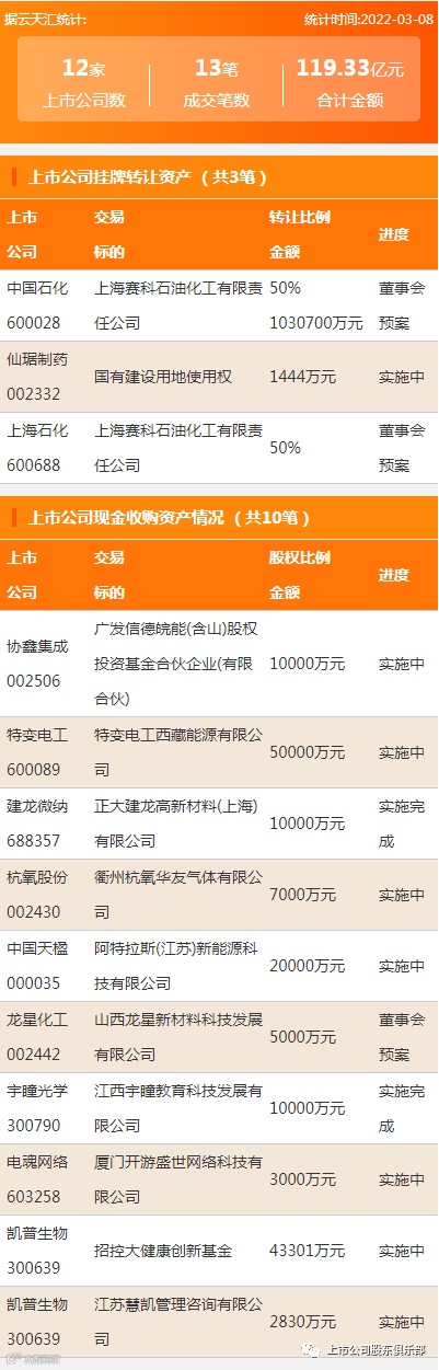 2022年3月8日,资产交易合计金额119.33亿元,上市公司12家,成交13笔,上市公司挂牌转让资产3笔,上市公司现金收购资产10笔。