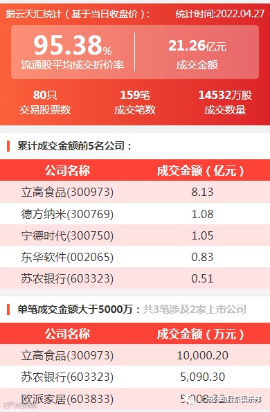 2022年4月27日,大宗交易成交金额21.26亿元,交易股票数80只,成交笔数159笔,流通股平均成交折价率95.38%,成交数量14532万股。