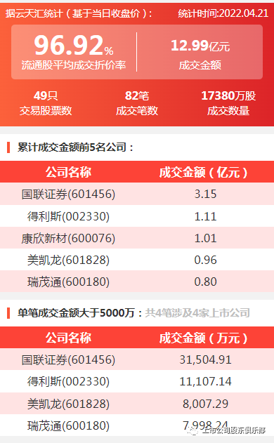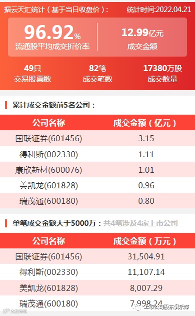 2022年4月21日,大宗交易成交金额12.99亿元,交易股票数49只,成交笔数82笔,流通股平均成交折价率96.92%,成交数量17380万股。