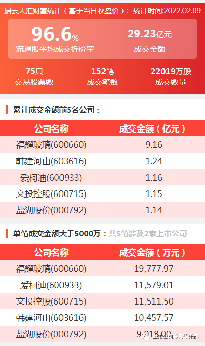 2022年2月9日,大宗交易成交金额29.23亿元,交易股票数75只,成交笔数152笔,流通股平均成交折价率96.6%,成交数量22019万股。