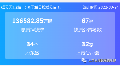 2022年3月24日,股票质押总质押股数136582.85万股,上市公司数32家,股质公告笔数67笔,股东数34个。
