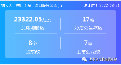 2022年3月21日,股票质押总质押股数23322.05万股,上市公司数7家,股质公告笔数17笔,股东数8个。