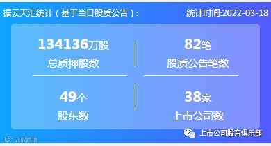 2022年3月18日,股票质押总质押股数134136万股,上市公司数38家,股质公告笔数82笔,股东数49个。