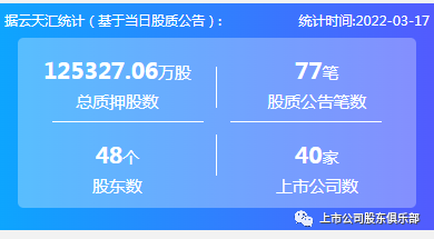 2022年3月17日,股票质押总质押股数125327.06万股,上市公司数40家,股质公告笔数77笔,股东数48个。