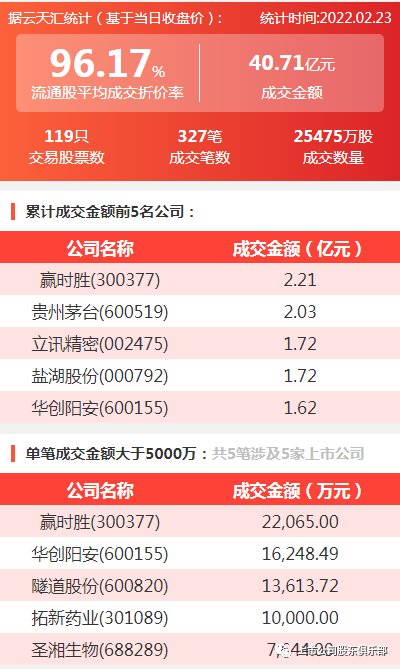 2022年2月23日,大宗交易成交金额40.71亿元,交易股票数119只,成交笔数327笔,流通股平均成交折价率96.17%,成交数量25475万股。