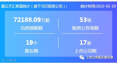 2022年2月10日,股票质押总质押股数72188.09万股,上市公司数17家,股质公告笔数53笔,股东数19个。