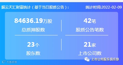 2022年2月9日,股票质押总质押股数84636.19万股,上市公司数21家,股质公告笔数42笔,股东数23个。