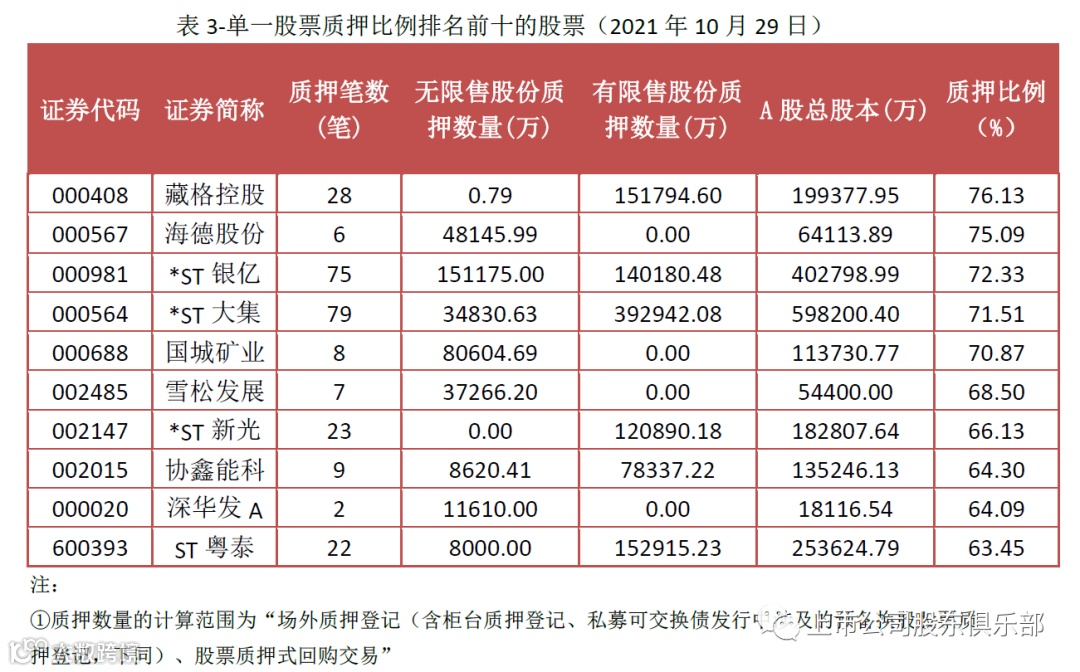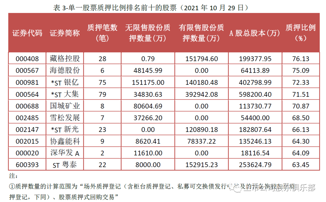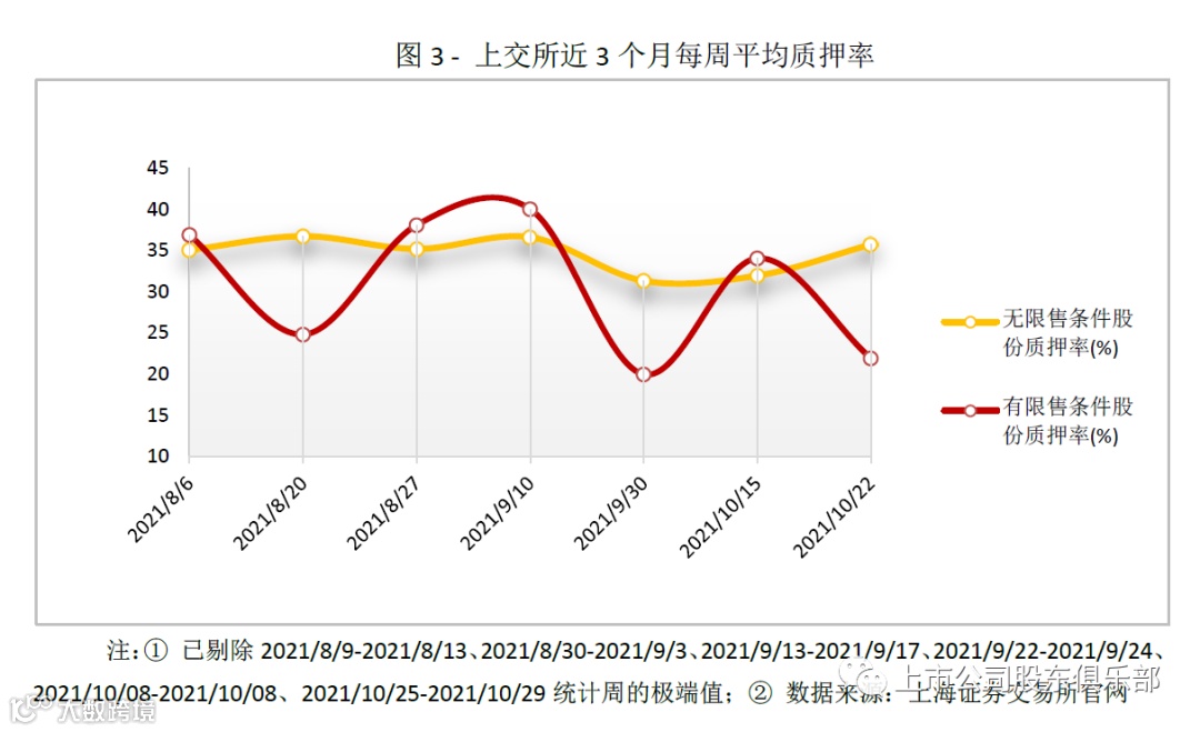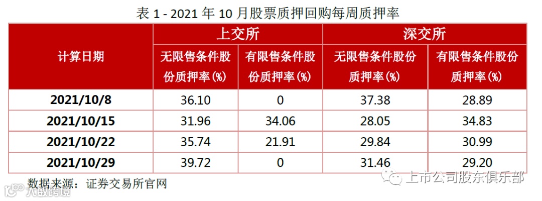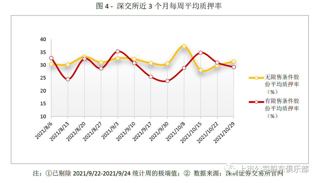 2021年10月最后一个交易周数据显示,上交所无限售股平均质押率为39.72%,限售股无数据。深交所无限售股平均质押率为31.46%,限售股平均质押率为29.20%。