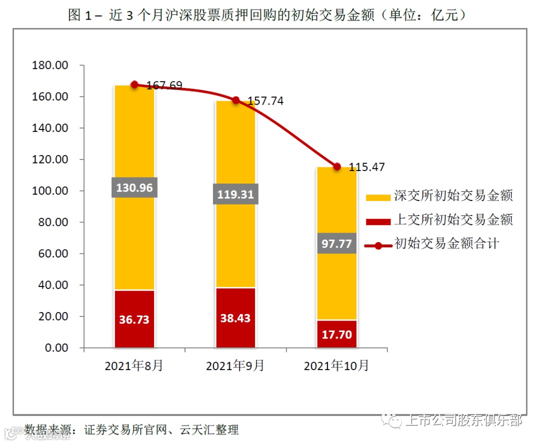10月沪深股票质押回购的初始交易金额合计为115.47亿元,相比9月减少26.80%,相比去年同期减少34.14%,其中上交所初始交易金额为17.70亿元,相比9月减少53.94%,相比去年同期减少80.32%;深交所初始交易金额为97.77亿元,相比9月减少18.05%,相比去年同期增加14.50%。沪深购回交易金额合计为104.84亿元,相比9月减少32.37%,其中上交所为48.34亿元,深交所为56.50亿元。
