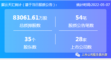 2022年5月7日,股票质押总质押股数83061.61万股,上市公司数28家,股质公告笔数54笔,股东数35个。