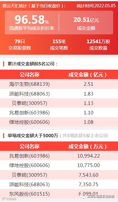 2022年5月5日,大宗交易成交金额20.51亿元,交易股票数79只,成交笔数155笔,流通股平均成交折价率96.58%,成交数量12541万股。