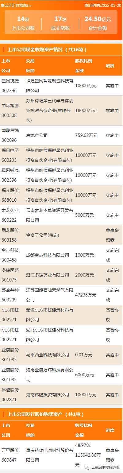 2022年1月20日,资产交易合计金额24.5亿元,上市公司14家,成交17笔,上市公司现金收购资产16笔,上市公司发行股份购买资产1笔。