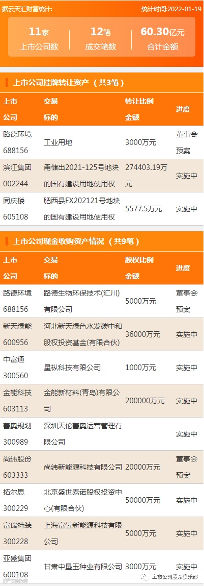 2022年1月19日,资产交易合计金额60.3亿元,上市公司11家,成交12笔,上市公司挂牌转让资产3笔,上市公司现金收购资产9笔。