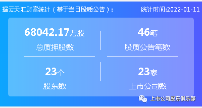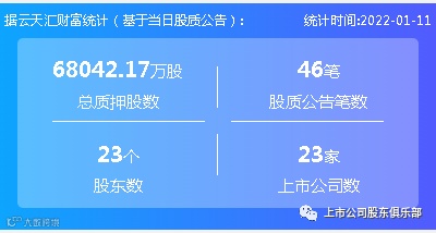 2022年1月11日,股票质押总质押股数68042.17万股,上市公司数23家,股质公告笔数46笔,股东数23个。