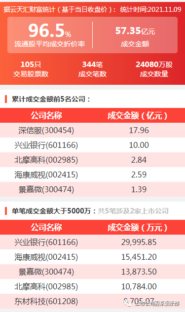 2021年11月9日,大宗交易成交金额57.35亿元,交易股票数78只,成交笔数344笔,流通股平均成交折价率96.5%,成交数量24080万股。