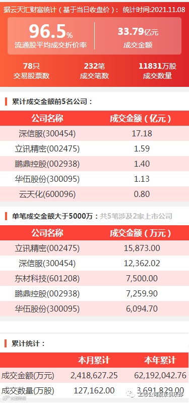 2021年11月8日,大宗交易成交金额33.79亿元,交易股票数78只,成交笔数232笔,流通股平均成交折价率96.5%,成交数量11831万股。