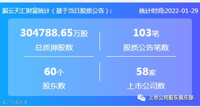 2022年1月29日,股票质押总质押股数304788.65万股,上市公司数58家,股质公告笔数103笔,股东数60个。