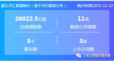 2021年11月22日,股票质押总质押股数26022.5万股,上市公司数3家,股质公告笔数11笔,股东数3个。