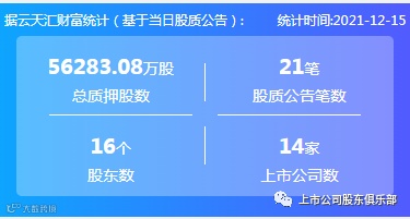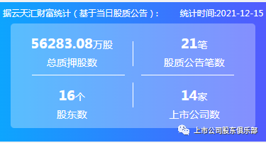 2021年12月15日,股票质押总质押股数56283.08万股,上市公司数14家,股质公告笔数21笔,股东数16个。