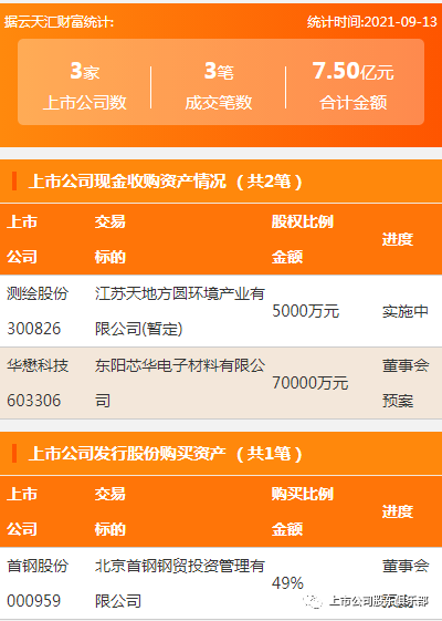 导读:2021年9月13日,资产交易合计金额7.5亿元,上市公司数3家,成交笔数3笔,上市公司挂牌转让资产2笔,上
