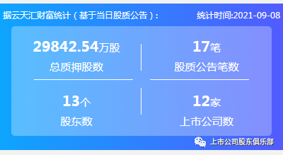 2021年9月8日,股票质押总质押股数29842.54万股,上市公司数12家,股质公告笔数17笔,股东数13个。