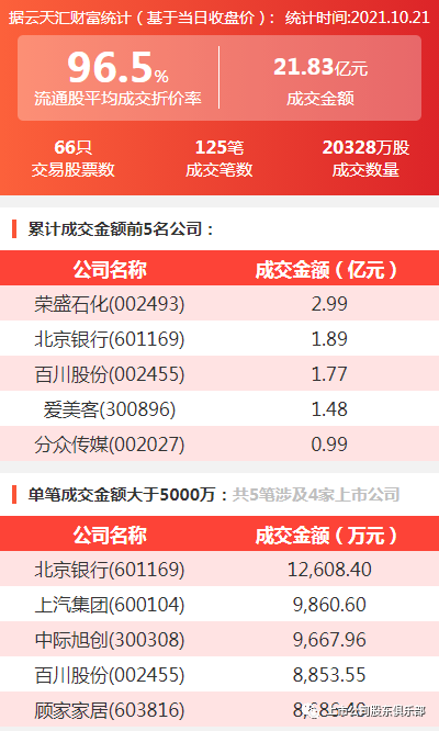 2021年10月21日,大宗交易成交金额21.83亿元,交易股票数66只,成交笔数125笔,流通股平均成交折价率96.5%,成交数量20328万股。