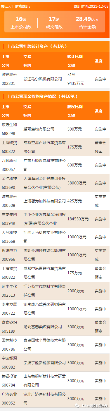 导读:2021年12月08日,资产交易合计金额28.49亿元,上市公司16家,成交17笔,上市公司挂牌转让资产1笔