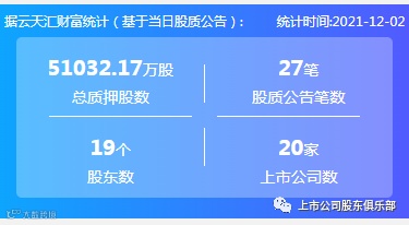 2021年12月02日,股票质押总质押股数51032.17万股,上市公司数20家,股质公告笔数27笔,股东数19个。