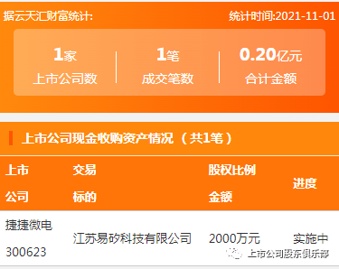 导读:2021年11月1日,资产交易合计金额0.2亿元,上市公司1家,成交1笔,上市公司现金收购资产1笔。