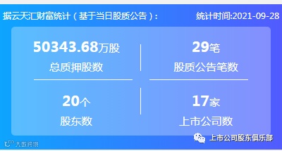 2021年9月28日,股票质押总质押股数50343.68万股,上市公司数17家,股质公告笔数29笔,股东数20个。